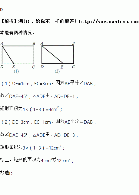 矩形一个角的平分线分矩形一边为1cm和3cm两部分,则这个矩形的面积为( )