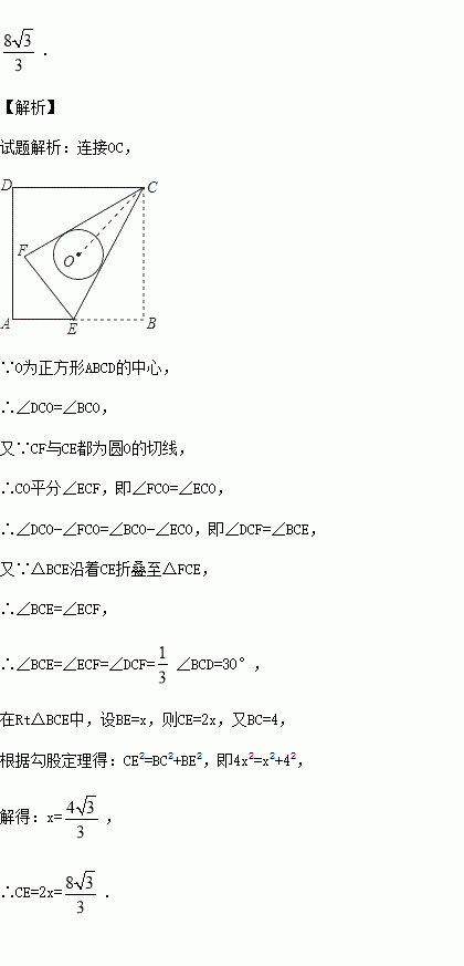 如图,正方形ABCD的边长为4,点E是AB上的一点,将△BCE沿CE折叠至△FCE,若CF,CE恰好与以正方形ABCD的中心为圆心的⊙O相切,则折痕CE的长为 .