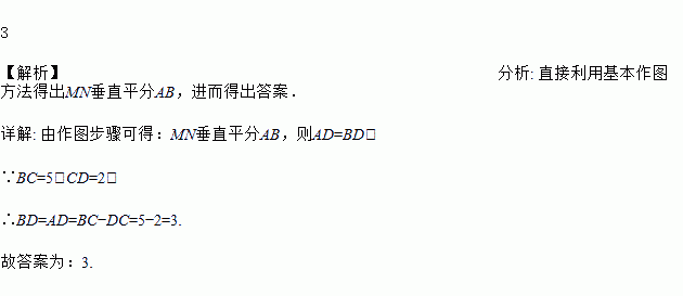 在△ABC中,分别以点A和点B为圆心,大于AB的长为半径画弧,两弧相交于M,N,作直线MN,交BC于点D,连接AD.如果BC=5,CD=2,那么AD=__.