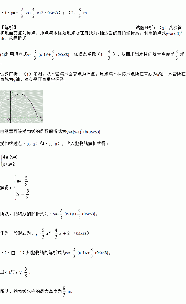 随着新农村的建设和旧城的改造,我们的家园越来越美丽,小明家附近广场中央新修了个圆形喷水池,在水池中心竖直安装了一根高为2米的喷水管,它喷出的抛物线形水柱在与水池中心的水平距离为1米处达到最高,水柱落地处离池中心3米.