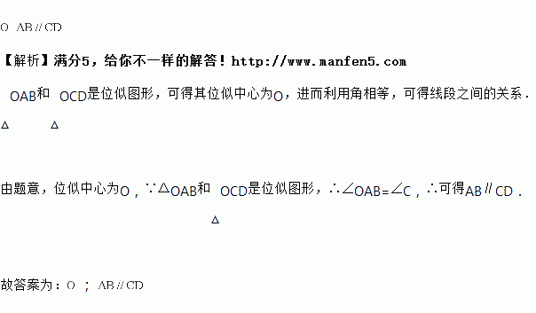 如图,和是位似图形,则位似中心是________;图中与的关系是________.