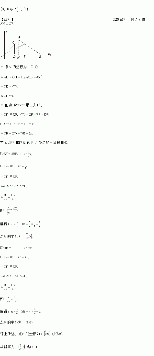 如图,在坐标平面内A(1,1),正方形CDEF的DE边在x轴上,C,F分别在OA和AB边上,连接OF,若△OEF和以E,F,B为顶点的三角形相似,则B点坐标为________________.