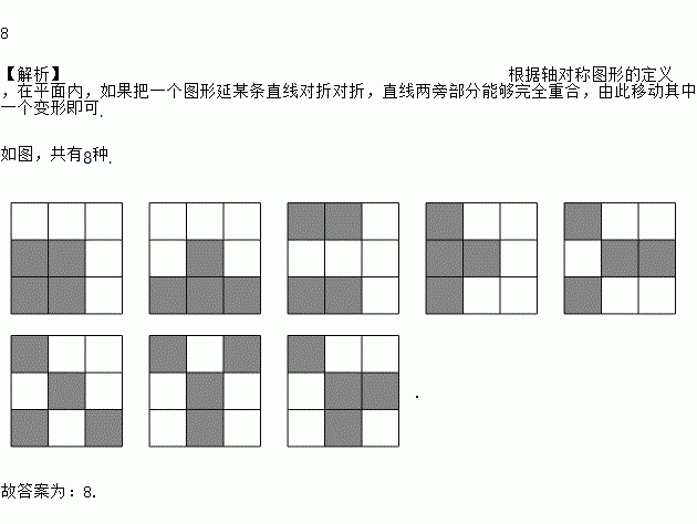如图,在正方形方格中,阴影部分是张小正方形纸片所形成的图案,只移动其中一张纸片,使得到的新图案成为一个轴对称图形的移法有__________种.