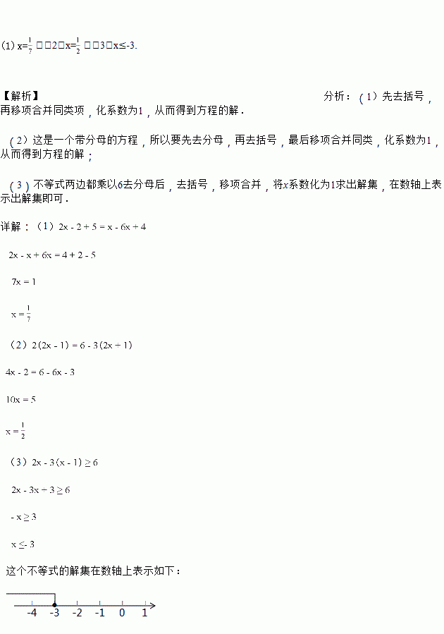 (1)解方程2(x-1)+5=x-2(3x-2) (2)解方程