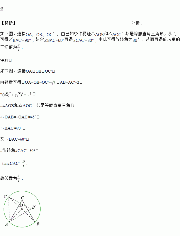 如图,正△ABC的边长为2,点A、B在半径为的圆上,点C在圆内,将正△ABC绕点A逆时针旋转,当点C第一次落在圆上时,旋转角的正切值是_______________.