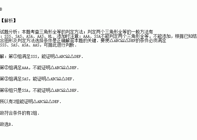 如图,给出下列四组条件:①AB=DE,BC=EF,AC=DF;②AB=DE,∠B=∠E,BC=EF;③∠B=∠E,BC=DF,∠C=∠F;④AB=DE,AC=DF,∠B=∠E.其中,能使△ABC≌△DEF的条件共有( )