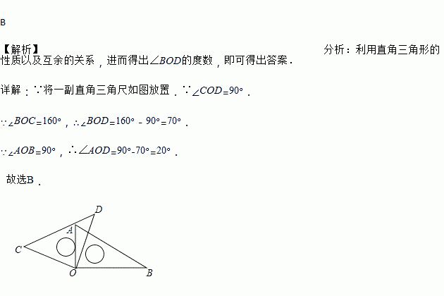 将一副直角三角尺如图放置,若∠BOC=160°,则∠AOD的大小为( )