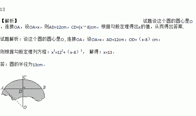 如图,残破的圆形轮片上,弦AB的垂直平分线交弧AB于点C,交弦AB于点D,AB=24 cm,CD=8 cm,则圆的半径为__ cm.