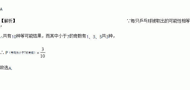 把标有1~10的10个乒乓球放在一个箱子中,摇匀后,从中任意取一个,号码为小于7的奇数的概率是( )