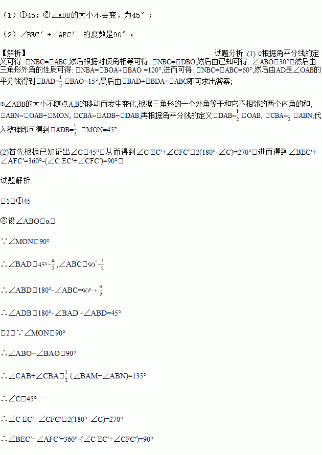 ②当点A、B分别在射线OM、ON上运动时(不与点O重合),试问:随着点A、B的运动,∠ADB的大小会变吗?如果不会,请求出∠ADB的度数;如果会,请求出∠ADB的度数的变化范围;