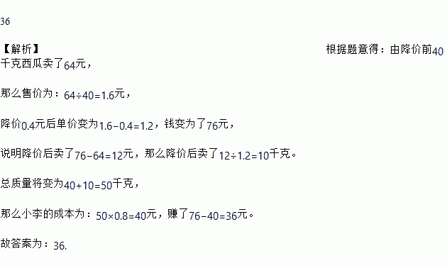 小李以0.8元/kg的价格从批发市场购进若干千克西瓜到市场去销售,在销售了部分西瓜之后,余下的每千克降价0.4元,全部售完,销售金额与销售量之间的关系如图所示,那么小李赚了__________元