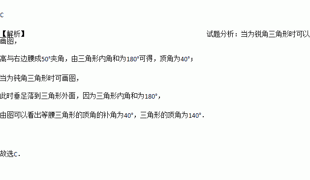 等腰三角形一腰上的高与另一腰的夹角为50°,则该三角形的顶角的度数为( )