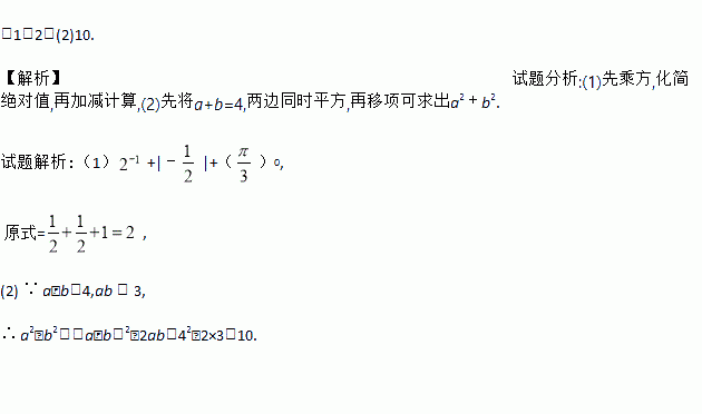 (1)2;(2)10. 【解析】试题分析:(1)先乘方,化简绝对值,再加减计算,(2)先将a+b=4,两边同时平方,再移项可求出a2﹢b2. 试题解析:(1)+|﹣|+()0, 原式=, (2) ∵ a﹢b=4,ab = 3, ∴ a2﹢b2=(a﹢b)2﹣2ab=42﹣2×3=10.