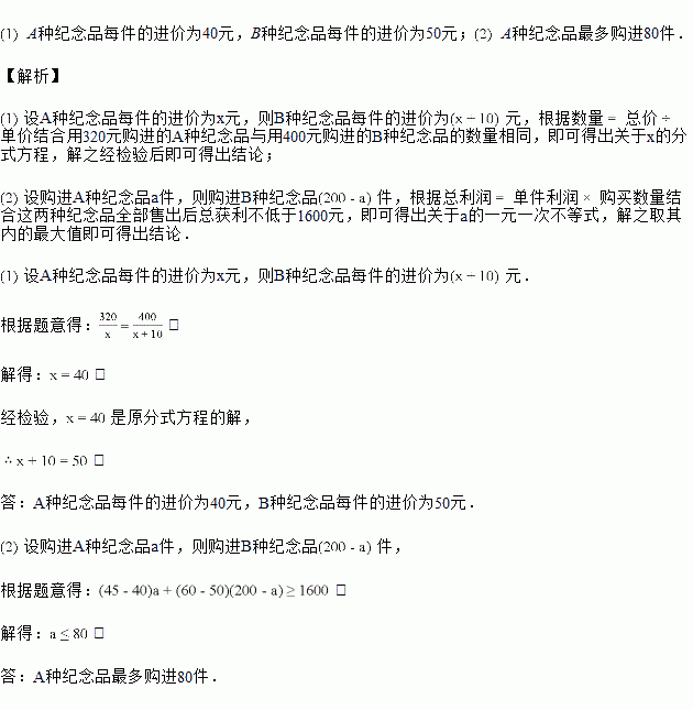 (2)若该商店A种纪念品每件售价45元,B种纪念品每件售价60元,这两种纪念品共购进200件,这两种纪念品全部售出后总获利不低于1600元,求A种纪念品最多购进多少件.