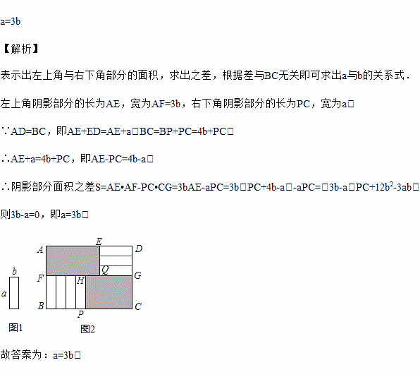 将7张如图1所示的长为a,宽为b(a>b)的小长方形纸片按图2所示的方式不重叠地放在长方形ABCD内,未被覆盖的部分(两个长方形)用阴影表示.设左上角与右下角的阴影部分的面积的差为S,当BC的长度变化时,按照同样的放置方式,S始终保持不变,求a,b满足的条件.