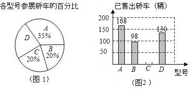 在萧山区第二届汽车展期间,某汽车经销商推出A、B、C、D四种型号的小轿车共1000辆进行展销.C型号轿车销售的成交率为50%,其它型号轿车的销售情况绘制在图1和图2两幅尚不完整的统计图中.