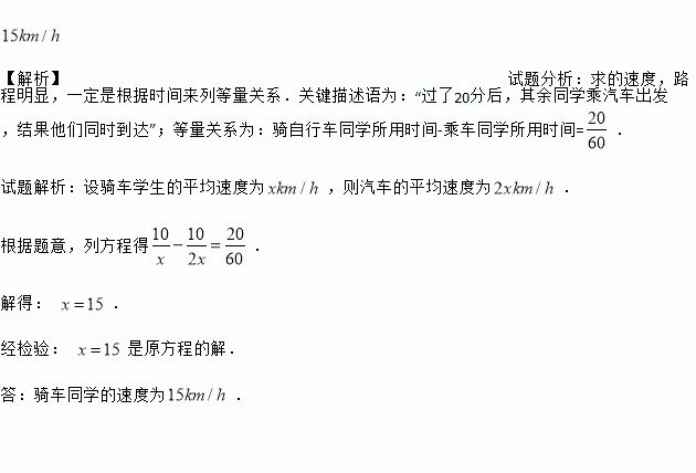 【解析】试题分析:求的速度,路程明显,一定是根据时间来列等量关系.关键描述语为:“过了20分后,其余同学乘汽车出发,结果他们同时到达”;等量关系为:骑自行车同学所用时间-乘车同学所用时间=. 试题解析:设骑车学生的平均速度为,则汽车的平均速度为. 根据题意,列方程得. 解得: . 经检验: 是原方程的解. 答:骑车同学的速度为.