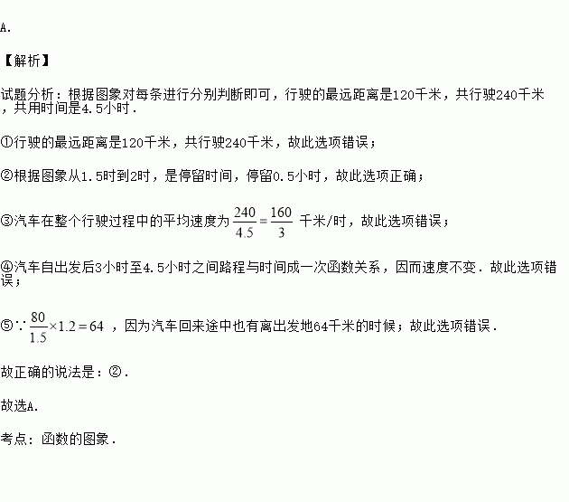 如图中的图像(折线ABCDE)描述了一汽车在某一直线上的行驶过程中,汽车离出发地的距离s(千米)和行驶时间t(小时)之间的函数关系,根据图中提供的信息,给出下列说法:①汽车共行驶了120千米;②汽车在行驶途中停留了0.5小时;③汽车在整个行驶过程中的平均速度为80.8千米/时;④汽车自出发后3小时至4.5小时之间行驶的速度在逐渐减小.⑤汽车离出发地64千米是在汽车出发后1.2小时时。其中正确的说法共有( )