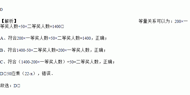 某班把1400元奖学金按照两种奖项奖给22名学生,其中一等奖每人200元,二等奖每人50元,设获得一等奖的学生人数为x,则下列方程不正确的是( )