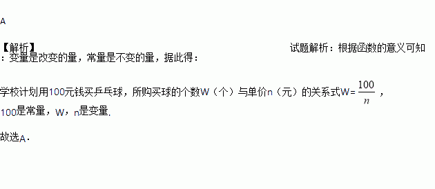 某学校用100元钱买乒乓球,所购买球的个数w与单价n(元)之间的关系是w=