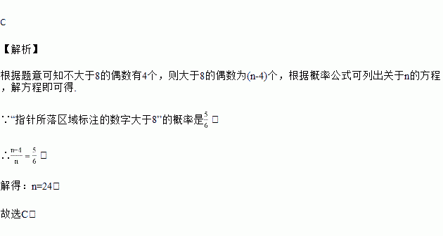 小明将如图所示的转盘分成n(n是正整数)个扇形,并使得各个扇形的面积都相等,然后他在这些扇形区域内分别标注连续偶数数字2,4,6,…,2n(每个区域内标注1个数字,且各区域内标注的数字互不相同),转动转盘1次,当转盘停止转动时,若事件“指针所落区域标注的数字大于8”的概率是