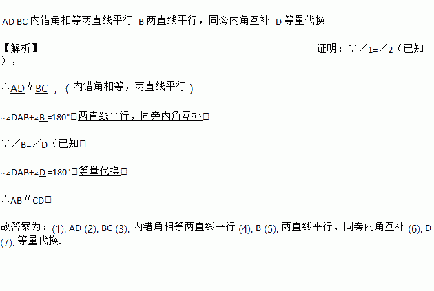 如图,完成下列推理,并填写理由,如图,∠B=∠D,∠1=∠2,求证:AB∥CD.