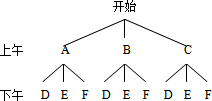 小刚参观上海世博会,由于仅有一天的时间,他上午从A-中国馆、B-日本馆、C-美国馆中任意选择一处参观,下午从D-韩国馆、E-英国馆、F-德国馆中任意选择一处参观.