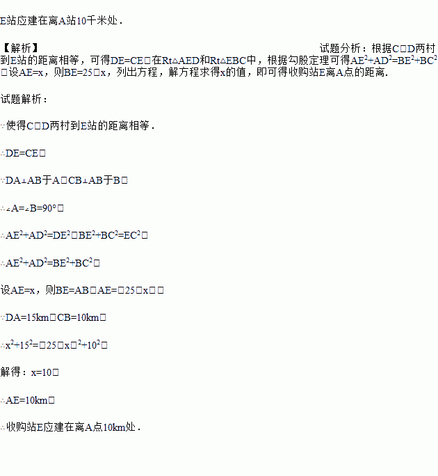 如图,铁路上A,B两点相距25 km,C,D为两村庄,DA⊥AB于点A,CB⊥AB于点B,已知DA=15 km,CB=10 km,现在要在铁路AB上建一个土特产品收购站E,使得C,D两村到E站的距离相等,则E站应建在离A站多少千米处?