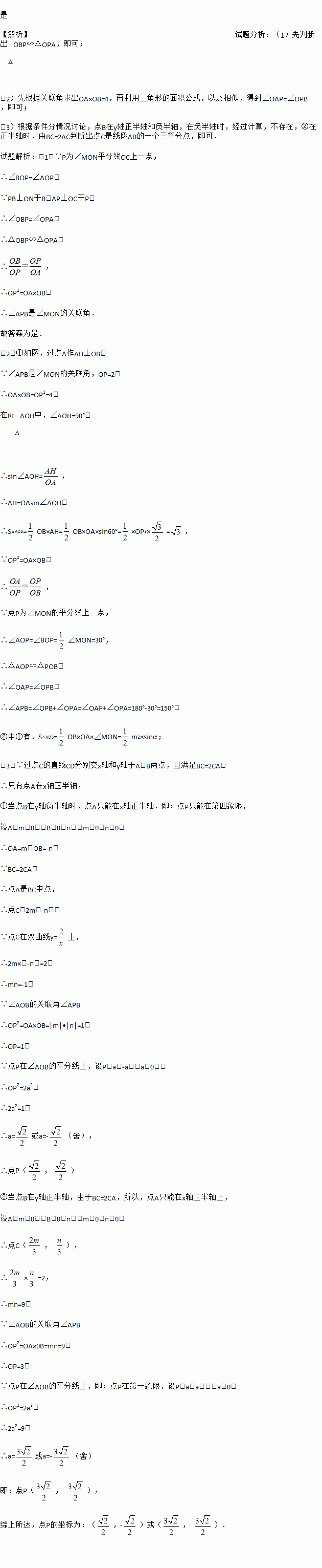 如图1,P为∠MON平分线OC上一点,以P为顶点的∠APB两边分别与射线OM和ON交于A、B两点,如果∠APB在绕点P旋转时始终满足OA•OB=OP2 , 我们就把∠APB叫做∠MON的关联角.