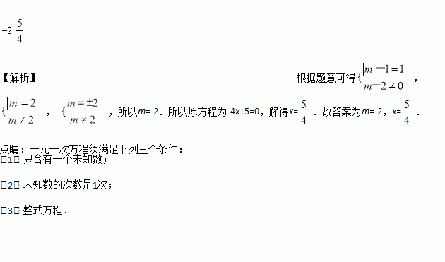 若(m-2)x|m|-1+5=0是关于x的一元一次方程,则m=_____,原方程的解为x=_____.