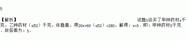 王大爷用280元买了甲、乙两种药材,甲种药材每千克20元,乙种药材每千克60元,且甲种药材比乙种药材多买了2千克.则甲种药材买了____________千克.