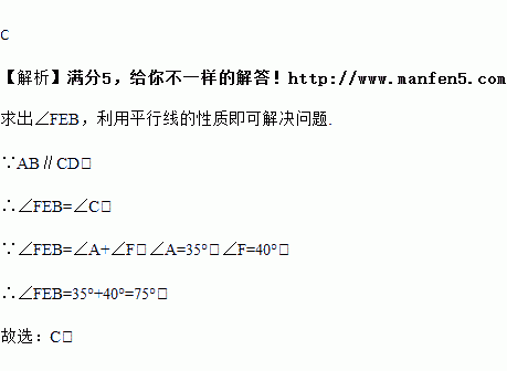 如图,AB∥CD,∠A=35°,∠F=40°,则∠C=( )