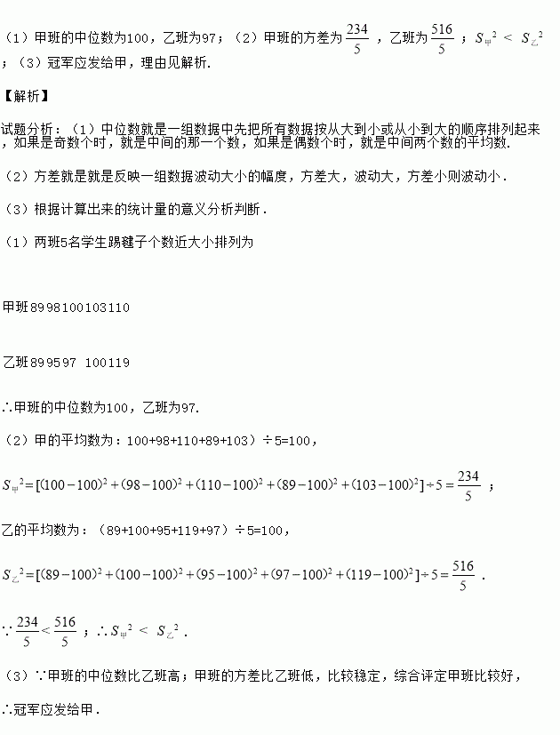 希望中学八年级学生开展踢毽子活动,每班派5名学生参加,按团体总分排列名次,在规定时间内每人踢100个以上(含100)为优秀.下表是成绩较好的甲班和乙班5名学生的比赛成绩(单位:个)
