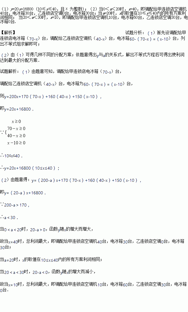 ºÏ·Ê°Ù´ó¼¯ÍÅнøÁË40̨¿Õµ÷»ú£¬60̨µç±ùÏ䣬¼Æ»®µ÷Å䏸ÏÂÊôµÄ¼×¡¢ÒÒÁ½¸öÁ¬ËøµêÏúÊÛ£¬ÆäÖÐ70̨¸ø¼×Á¬Ëøµê£¬30̨¸øÒÒÁ¬Ëøµê£®Á½¸öÁ¬ËøµêÏúÊÛÕâÁ½ÖÖµçÆ÷ÿ̨µÄÀûÈó£¨Ôª£©ÈçÏÂ±í£º