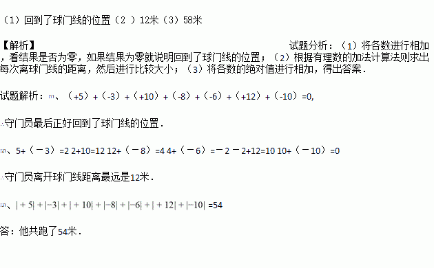 一名足球守门员练习折返跑,从球门线出发,向前记作正数,返回记作负数,他的记录如下:(单位:米)+5,-3,+10,-8,-6,+12,-10