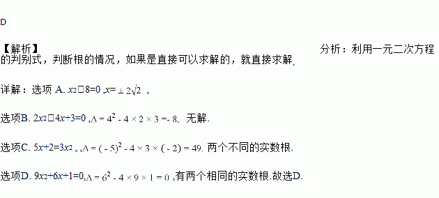 A. x2﹣8=0 B. 2x2﹣4x+3=0 C. 5x+2=3x2 D. 9x2+6x+1=0