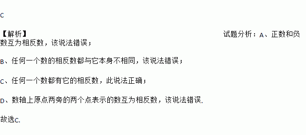 C 【解析】试题分析:A、正数和负数互为相反数,该说法错误; B、任何一个数的相反数都与它本身不相同,该说法错误; C、任何一个数都有它的相反数,此说法正确; D、数轴上原点两旁的两个点表示的数互为相反数,该说法错误. 故选C.