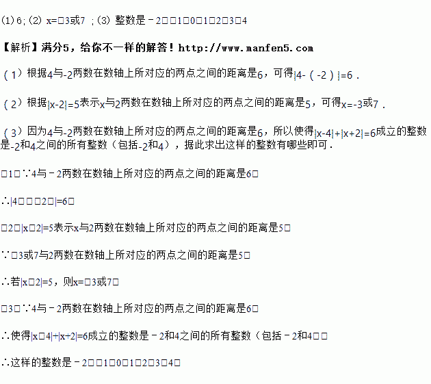 (3)同理|x﹣4|+|x+2|=6表示数轴上有理数x所对应的点到4和﹣2所对应的两点距离之和,请你找出所有符合条件的整数x,使得|x﹣4|+|x+2|=6,写出求解的过程.