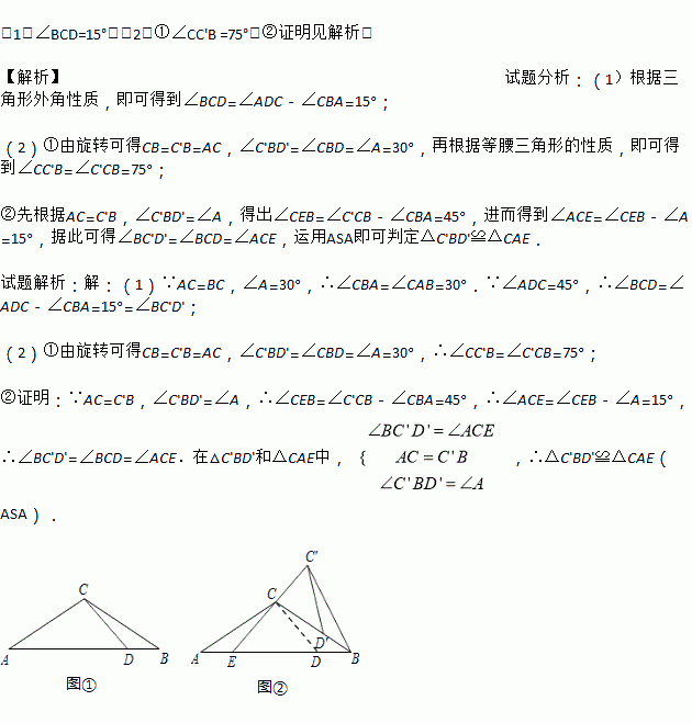(2)将图①中的△BCD绕点B顺时针旋转,得到△BC′D′.当点D′恰好落在BC边上时,如图②所示,连接C′C并延长交AB于点E.