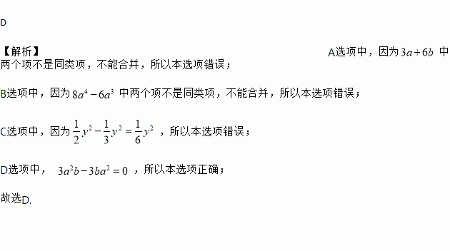 A. 3a+6b=9ab B. 8a4-6a3=2a C. D. 3a2b-3ba2=0