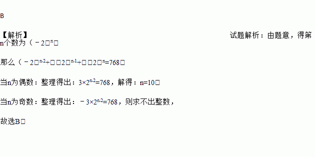 B 【解析】试题解析:由题意,得第n个数为(﹣2)n, 那么(﹣2)n﹣2+(﹣2)n﹣1+(﹣2)n=768, 当n为偶数:整理得出:3×2n﹣2=768,解得:n=10; 当n为奇数:整理得出:﹣3×2n﹣2=768,则求不出整数, 故选B.
