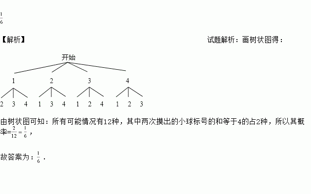 在一个不透明的袋子中有四个完全相同的小球,分别标号为1,2,3,4.随机摸取一个小球不放回,再随机摸取一个小球,两次摸出的小球的标号的和等于4的概率是________.