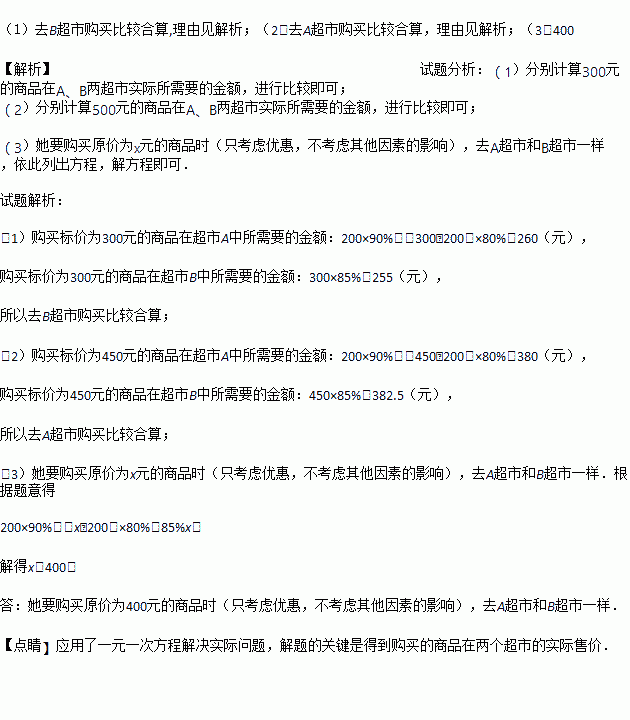 (2)若她要帮妈妈购买原价为450元的商品,那么她去哪家超市购买比较合算?