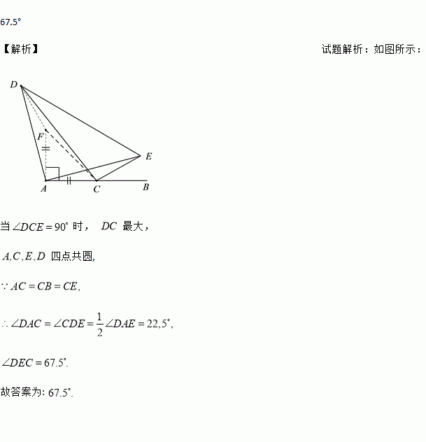 如图,点C为线段AB的中点,E为直线AB上方的一点,且满足CE=CB,连接AE,以AE为腰,A为顶角顶点作等腰Rt△ADE,连接CD,当CD最大时,∠DEC=_______.