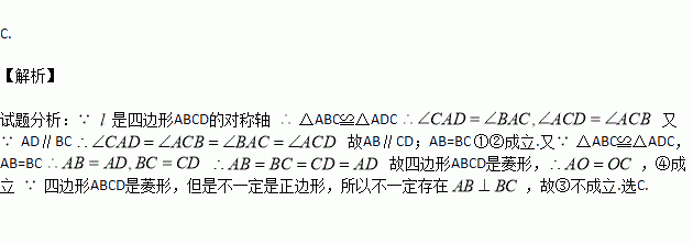 如图所示,是四边形ABCD的对称轴,AD∥BC,现给出下列结论:①AB∥CD;②AB=BC;③AB⊥BC;④AO=OC 其中正确的结论有( ).