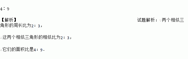 若两个相似三角形的周长比为2:3,则它们的面积比是_________.