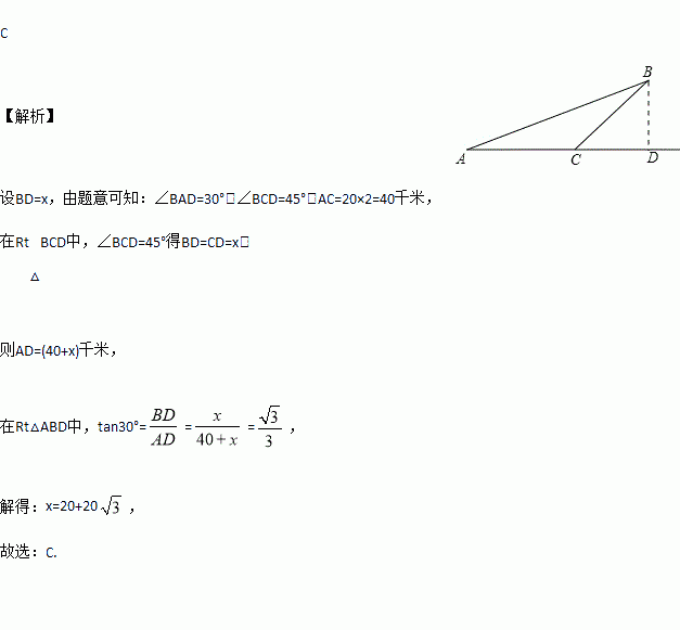 如图,一只船以每小时20千米的速度向正东航行,起初船在A处看见一灯塔B在船的北偏东60°方向上,2小时后,船在C处看见这个灯塔在船的北偏东45°方向上,则灯塔B到船所在的航线AC的距离是( )