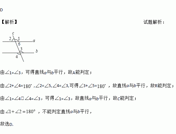 如图,直线a、b被直线c所截,下列条件不能判定直线a与b平行的是( )