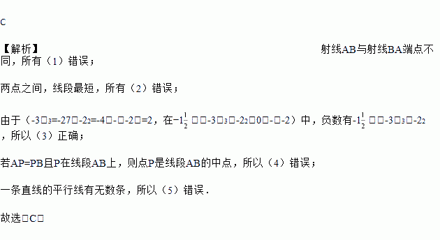 ,(﹣3)3 , ﹣22 , 0,﹣(﹣2)中,负数的个数有3个;(4)若AP=PB,则点P是线段AB的中点;(5)一条直线的平行线有且只有一条.其中错误的个数为( )