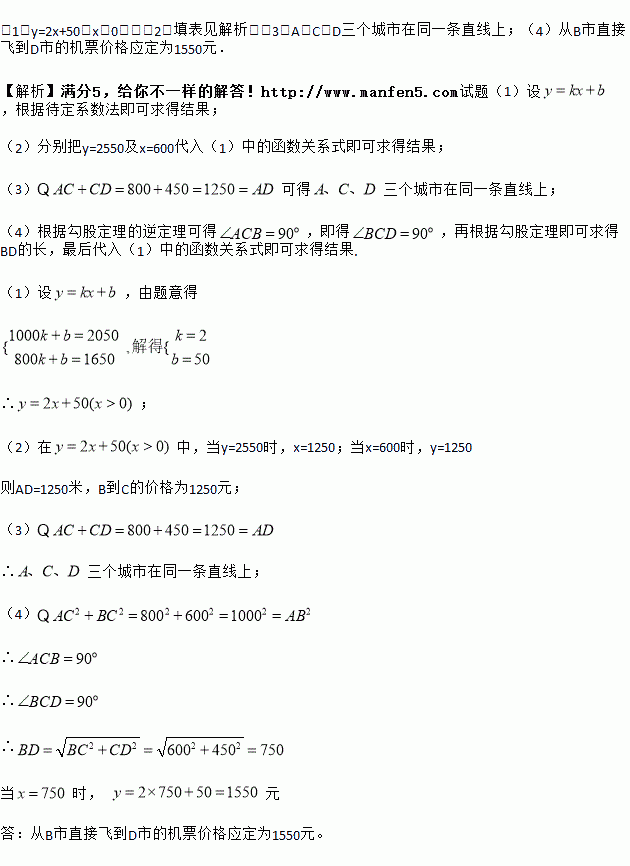 (4)若航空公司准备从旅游旺季的7月开始增开从B市直接飞到D市的旅游专线,且按以上规律给机票定价,那么机票定价应是多少元?
